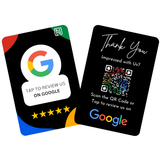 oost your online presence and streamline customer feedback collection with our Google Review NFC Card. With just a tap of a smartphone, your customers can leave a Google review in seconds. No need to remember URLs or navigate complicated steps – the NFC card instantly redirects to your Google review page, making it easier for your customers to support your business.